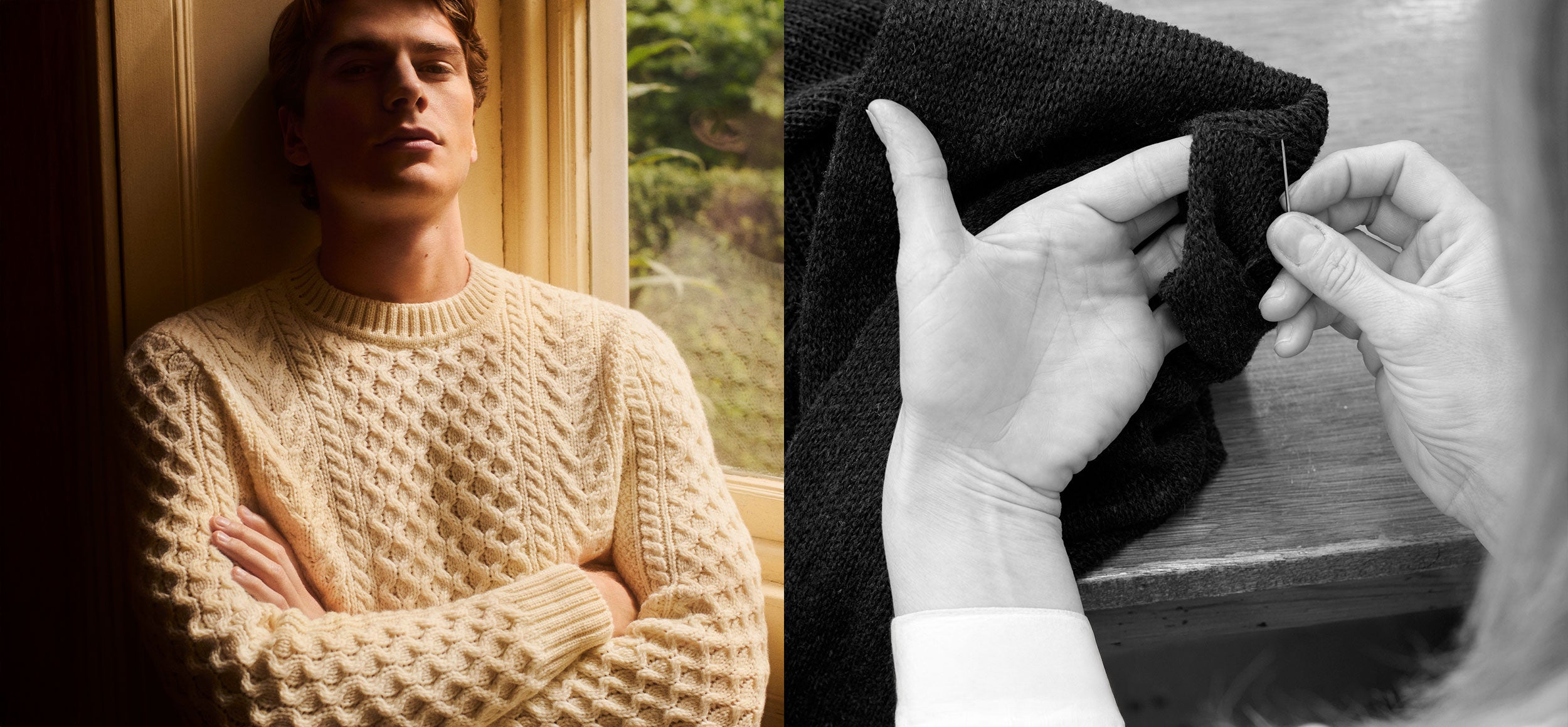 非常に柔らかく上質な肌触りに仕上げた、タイムレスな英国製のニット。ヘビーウェイトのメリノウールを使用し、ケーブルニットとガンジーセーターを現代的に表現しました。