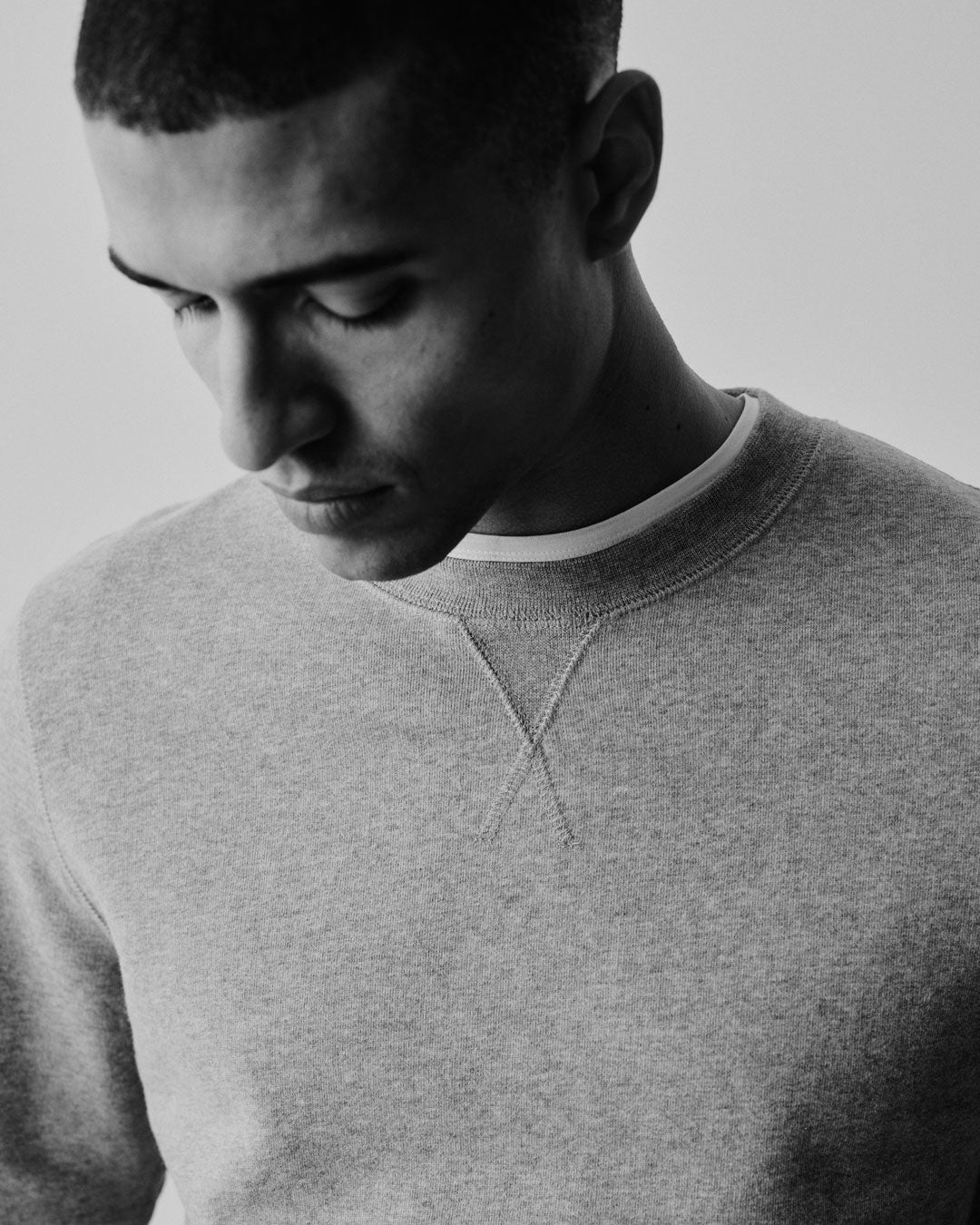 ディテールは機能的で控えめ。首元のVガゼットやリブ仕様の袖口は、伝統的なスポーツウェアへのさりげないオマージュです。すっきりとしたフィットで、ジャケットのインナーとしても、一枚でも自然に着こなせます。近年では映画『F1』でブラッド・ピットが着用したことで注目を集めましたが、このスウェットシャツが長く支持されてきた理由は、主張ではなく、そのシンプルさにあります。