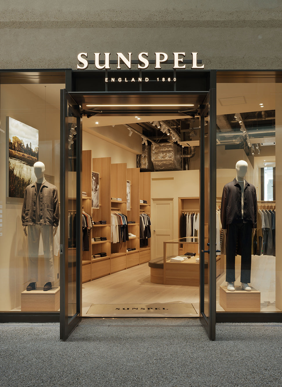 店頭では、フルラインのメンズウェアコレクションに加え、厳選したウィメンズウェアも展開しています。1860年にまで遡るサンスペルのアーカイブピースが店内に展示され、ブランドのヘリテージと進化を体感できる構成となっています。