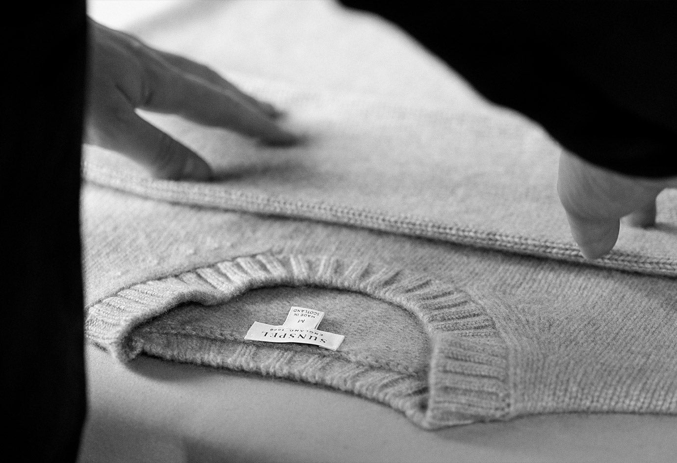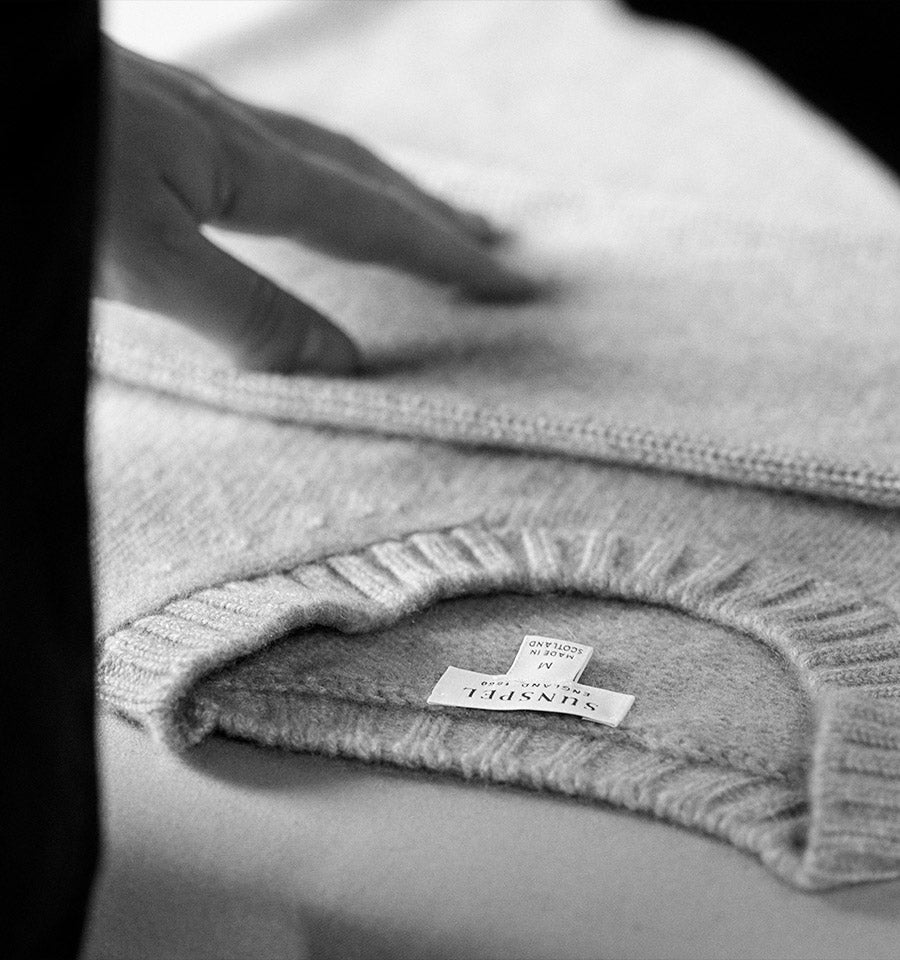 サンスペルは150年以上にわたり、カシミヤの技術を磨き続け、英国の専門知識を活かしてニットのあらゆる側面を洗練させてきました。モンゴルの遊牧民から倫理的に調達した最高級のグレードAのホワイトカシミヤを厳選し、スコットランド最古の紡績業者のひとつによってロッホ・レーベン湖畔で紡がれます。その後、軟水の天然湧き水で洗うことで繊維が開き、滑らかで軽やかな仕上がりになります。製品は英国のカシミヤ産業の中心地であるホイックの専門職人によって編み上げられ、比類のない快適さを誇る、時代を超えて愛されるニットウェアが完成します。