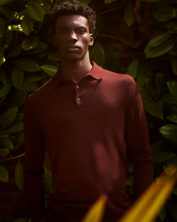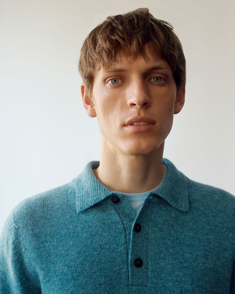 クラシックなポロシャツに着想を得た上質な一枚。イタリア紡績のエクストラファインメリノウールを使用し、伝統的なベントレーフレーム機で丁寧に仕立てました。シャープな襟元やナチュラルホーンボタン、リブ仕様の袖と裾が特徴で、軽やかな着心地は通年のレイヤリングに最適です。