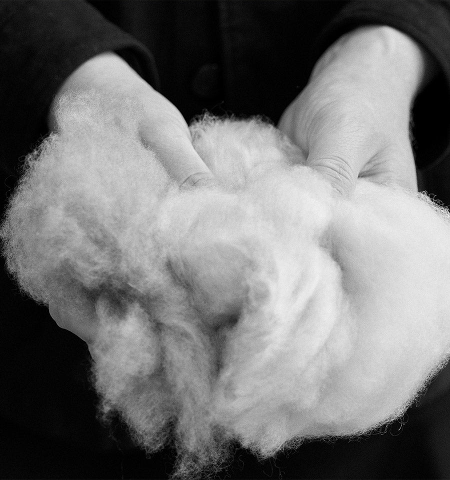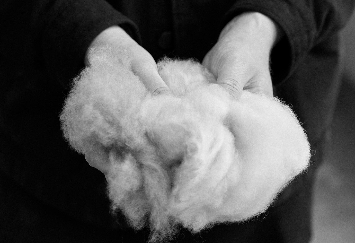 サンスペルは、子羊にやさしいノンミュールジング方法で調達された高品質のSUPER GEELONGラムズウールを使用しています。カシミヤと間違われるほど柔らかいこのウールは、スコットランド最古の紡績業者のひとつによってロッホ・レーベン湖畔で紡がれます。スコットランドの天然の湧き水で丁寧に洗うことで繊維が開き、非常に柔らかな手触りに仕上がります。製品はすべてスコットランドで地元の職人が編み上げ、細部までこだわった仕様で仕立てられ、時代を超えて愛される上質なニットウェアが完成します。