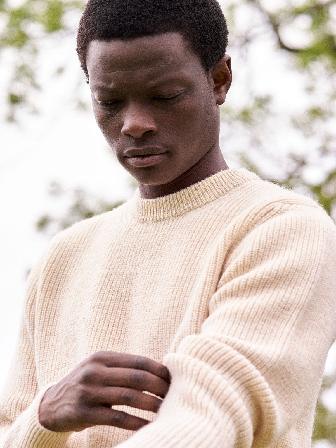 This season we have begun using an extremely special British wool with a rare softness. The result garments are truly local jumpers: farmed, scoured, spun and knitted in England, all within 150 miles of our factory in Long Eaton.